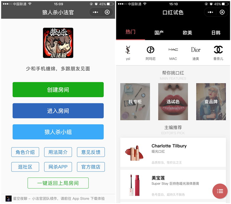 互動功能類小程序是近期刷屏最多的小程序,包含了匿名悄悄話、匿名吐槽、游戲助手(狼人殺等)、口紅試色等。