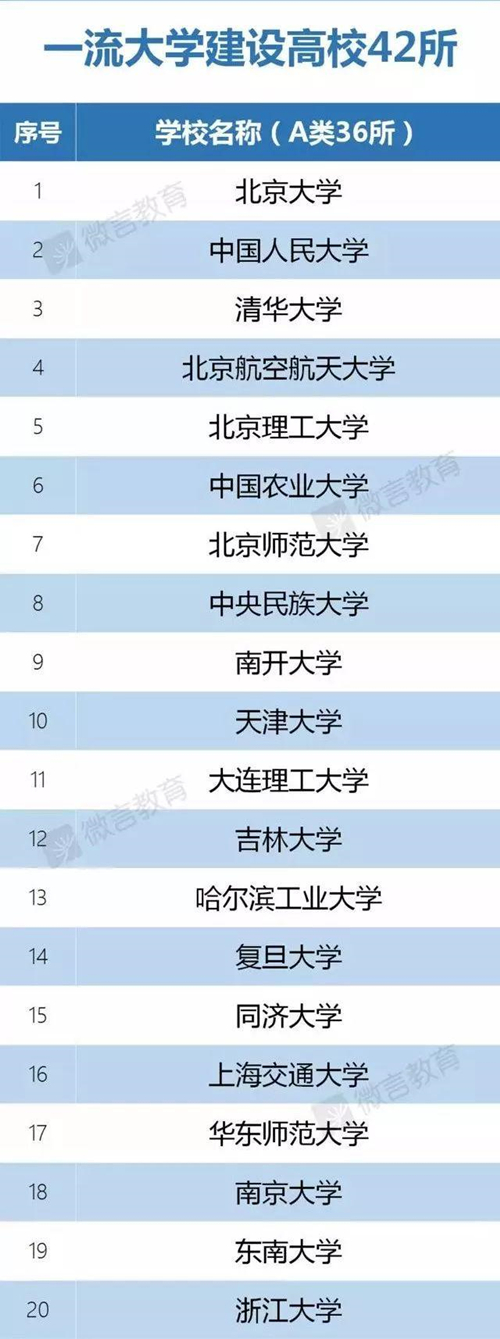 “雙一流”則是兩個(gè)平行的評(píng)價(jià)體系。“一流大學(xué)建設(shè)高校”重在一流學(xué)科基礎(chǔ)上的學(xué)校整體建設(shè)、重點(diǎn)建設(shè),全面提升人才培養(yǎng)水平和創(chuàng)新能力,共計(jì)42所,在原來39所985大學(xué)基礎(chǔ)上新增3所。