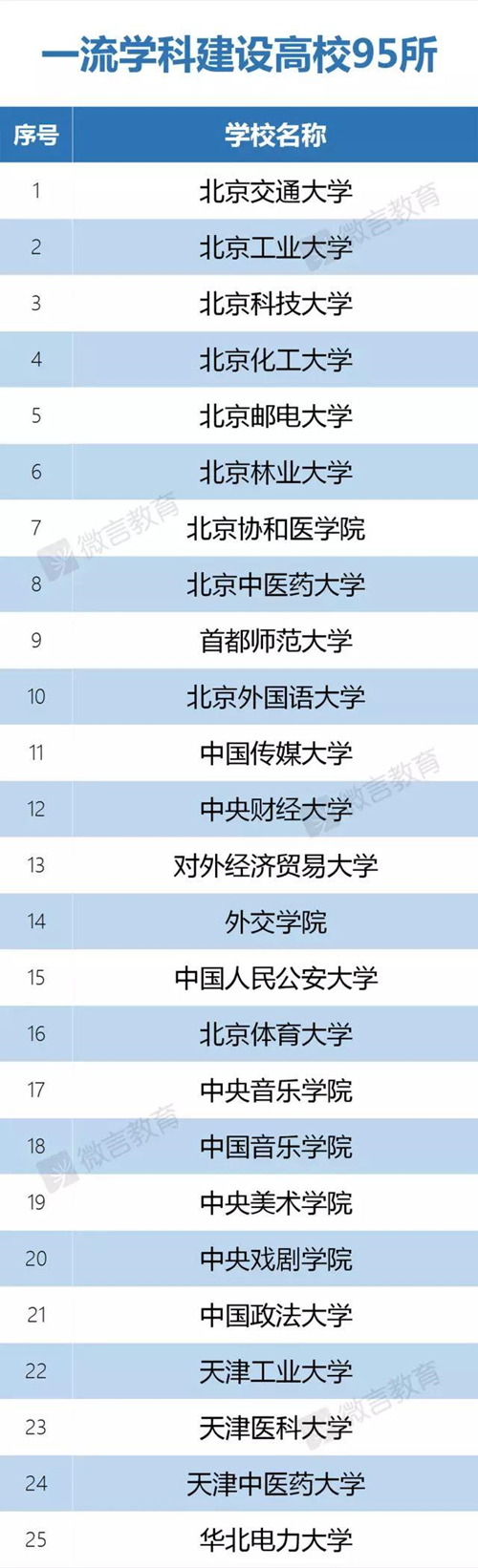 “一流學(xué)科建設(shè)高校”重在優(yōu)勢(shì)學(xué)科建設(shè),促進(jìn)特色發(fā)展,共計(jì)95所。除了之前的大部分“非985”211大學(xué),主要增加了26所特色明顯的高校——