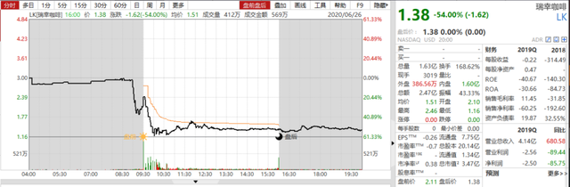 消息一出,開(kāi)盤(pán)后瑞幸暴跌,連續(xù)六次觸發(fā)熔斷,最大跌幅超60%。最終收盤(pán)價(jià)為1.38美元/ADS,跌幅為54%。