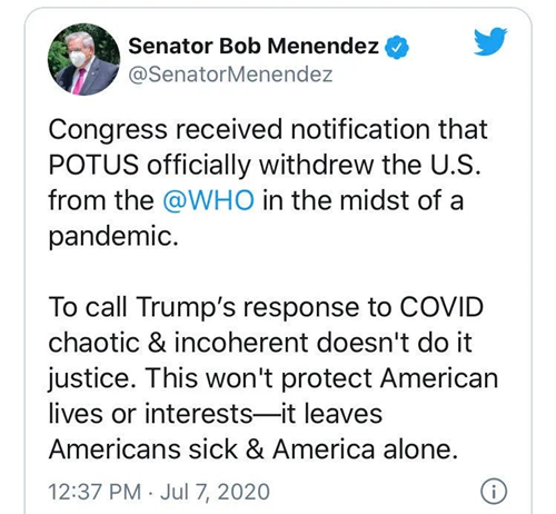 “國會收到通知,美國總統(tǒng)在全球疫情大流行期間,正式將美國從世衛(wèi)組織中撤出。”美國國會參議院外交關(guān)系委員會成員羅伯特·梅嫩德斯7月7日則稱,特朗普在新冠疫情應(yīng)對中表現(xiàn)出“混亂和前后不一”,退出世衛(wèi)組織的舉動“不會保護美國人民的生命或利益,而是使美國人生病,使美國孤立無援”。