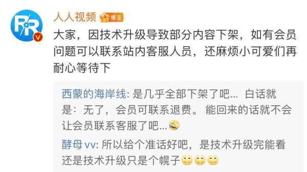 對此,人人視頻官方賬號在微博平臺回應稱,“因技術升級導致部分內容下架,如有會員問題可以聯系站內客服人員,還麻煩小可愛們再耐心等待下”。