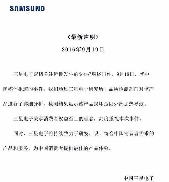 8月中旬,Note7持續(xù)爆炸,三星立刻對美國、韓國進(jìn)行召回,而對中國只用了200字的聲明,就被排除在外。