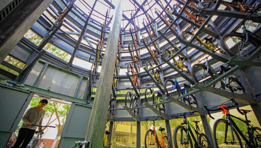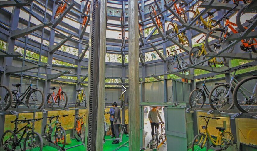 據(jù)了解,該存車樓主體為高8米,直徑8米的圓筒狀鋼結(jié)構(gòu),可存放120輛20-26英寸的自行車,通過(guò)刷身份證、學(xué)生卡可將自行車快速便捷的存放在車庫(kù)內(nèi)。