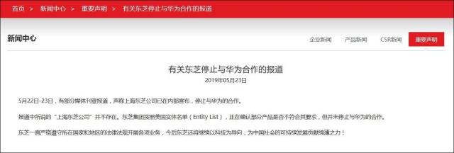 東芝中國官網(wǎng)23日發(fā)表一份聲明說,有部分媒體稱上海東芝公司已在內(nèi)部宣布停止與華為的合作,但報道中所說的“上海東芝公司”并不存在。東芝集團“并未停止與華為的合作”。