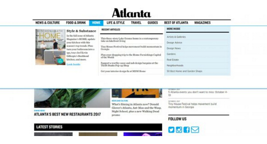 Atlanta Magazine 的大型導(dǎo)航菜單給人的體驗(yàn)就非常流暢,下拉菜單中嵌入了大量的鏈接。由于響應(yīng)式的滑動(dòng)導(dǎo)航在移動(dòng)端上也已經(jīng)很常見(jiàn)了,這使得它還輕松兼顧到了移動(dòng)端的設(shè)計(jì)。