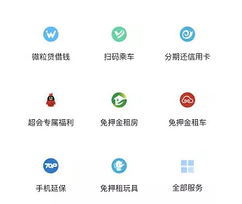 微粒貸借錢、掃碼乘車、分期還信用卡、超會(huì)專屬福利、免押金租房、免押騎摩拜、免押金租車、手機(jī)延保等眾多服務(wù)。
